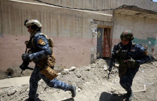 Des forces irakiennes avancent dans les rues de Mossoul lors d'une offensive contre les jihadistes de l'EI, le 18 juin 2017 © AFP AHMAD AL-RUBAYE