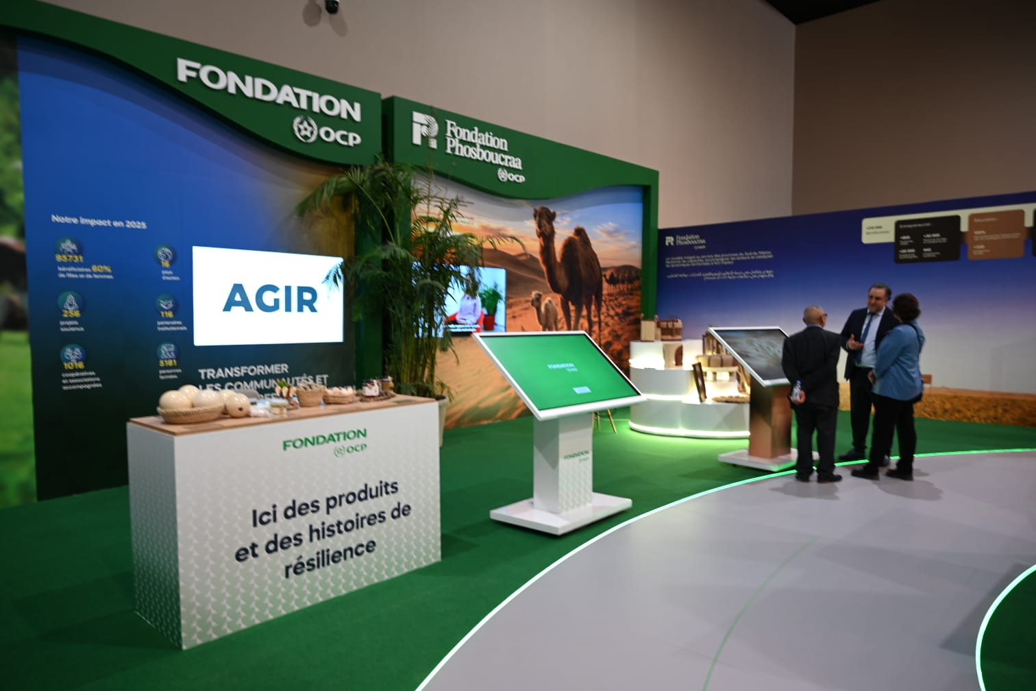 Pour cette édition consacrée à la production animale, le Groupe OCP a conçu son pavillon comme un parcours immersif qui suit le cheminement du phosphore à travers les différents maillons de la chaîne agricole. Le visiteur est invité à suivre la molécule depuis la mine, puis les sols, la science, la plante, jusqu’à l’alimentation animale et aux communautés.